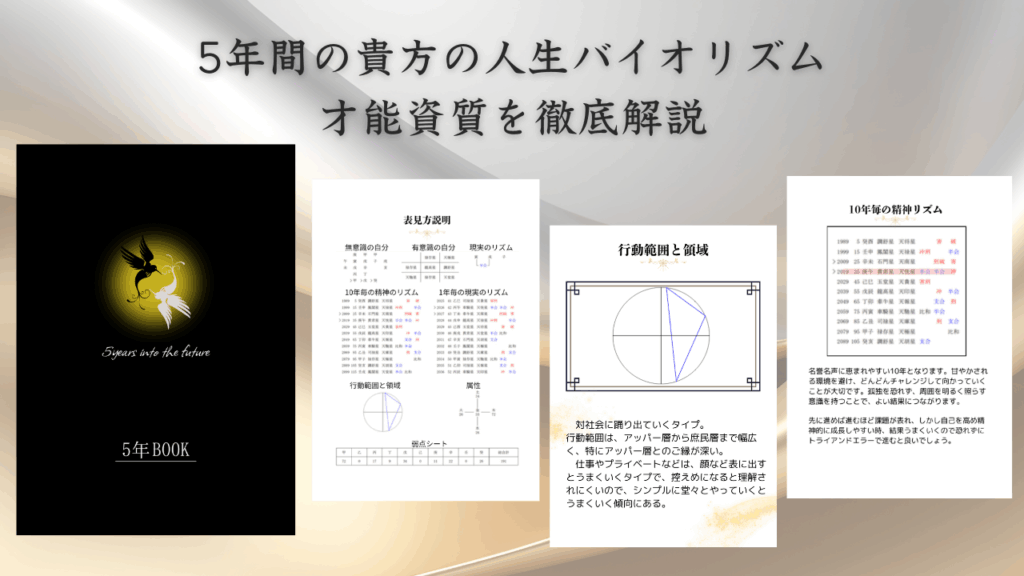 お申込みした月の翌月から5年間分の人生バイオリズムを書籍で作成。