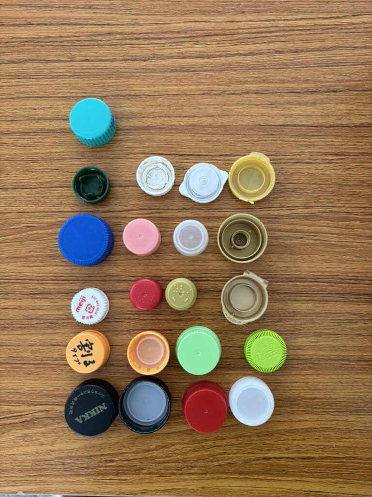 今回は、回収と同時に、分別も行いました!下の写真にあるような、豆乳やパックジュースのキャップ、調味料のキャップ、ハイターのキャップのような「清涼飲料水」以外のペットボトルキャップは素材が違うため、ワクチン寄付のキャップとして持ち込み不可のものなのです。
